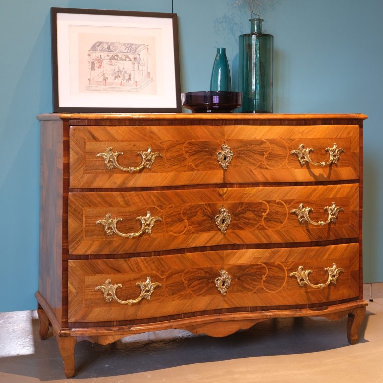 Die dreischübige Barockkommode ist ein typisches Beispiel einer süddeutschen Kommode aus der Mitte des 18. Jahrhunderts.