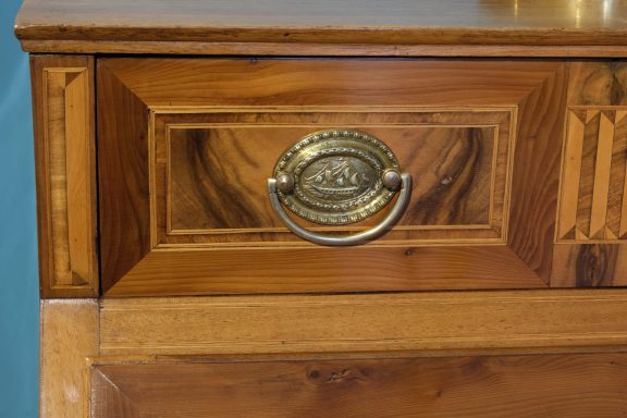 Der klassizistische Schrägklappensekretär, der um 1790 entstand, hat eine ungewöhnliche Furnierung. Hier wurde die typische Nussbaumgestaltung eines hochwertigen Möbels aus dieser Zeit mit einer Rahmung aus Eibenholz kombiniert. Dies ist ungewöhnlich und reizvoll und gibt dem Möbel eine angenehm Klarheit.