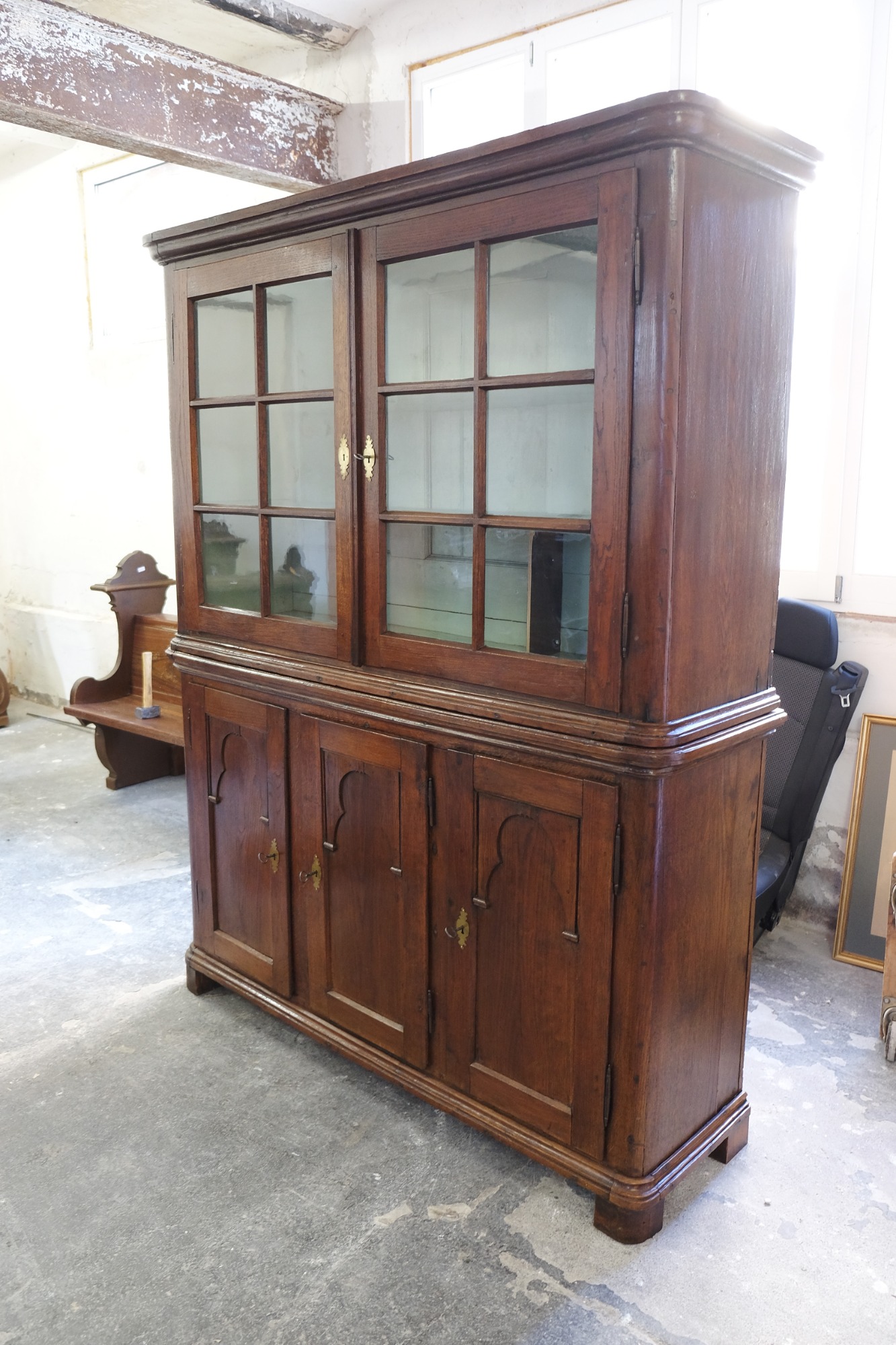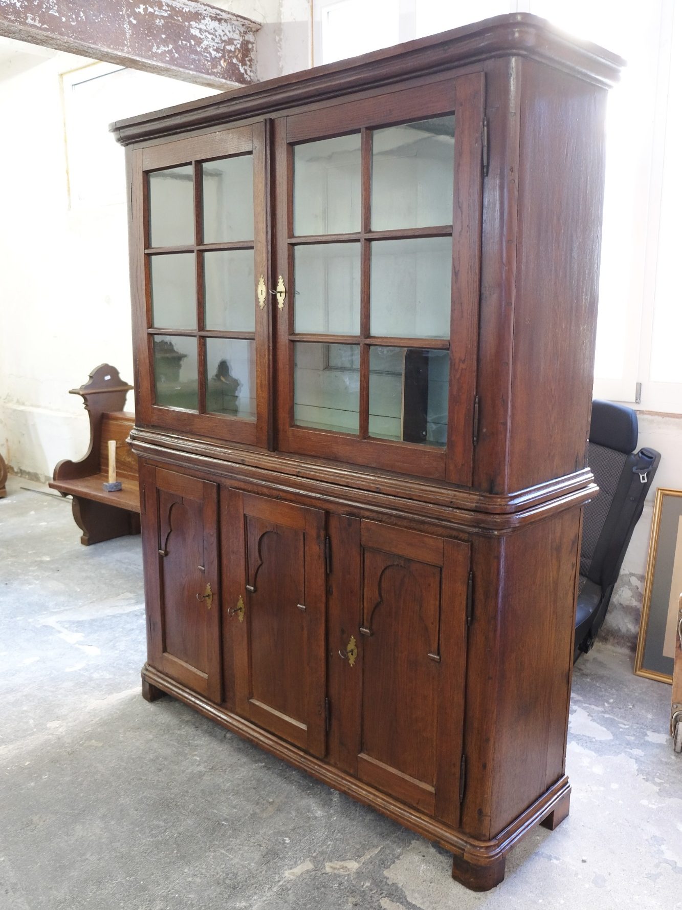 Küchenschrank mit Vitrinenaufsatz aus massivem Eichenholz
