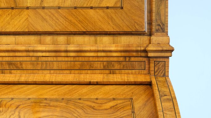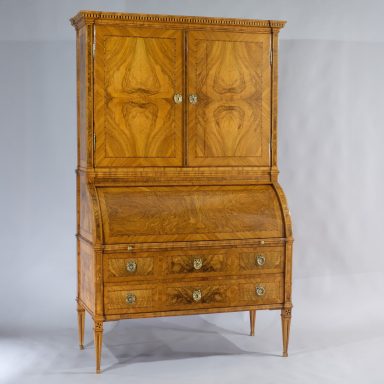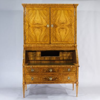 Der besonders fein gearbeitete Aufsatzsekretär besticht durch die hohe Qualität der Bandeinlagen und der, aus massivem Nussbaum hochkant ausgearbeiteten, detaillierten Profile. Ebenso besticht das Möbel durch die expressive Nussbaumfurniergestaltung der Flächen. Dieses Möbel dürfte um 1775 entstanden sein, vermutlich Sachsen.