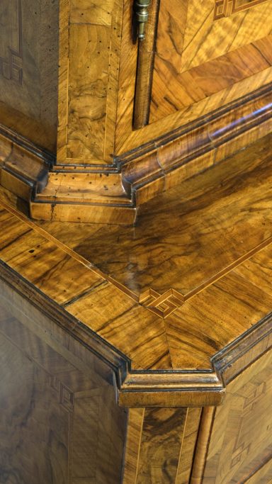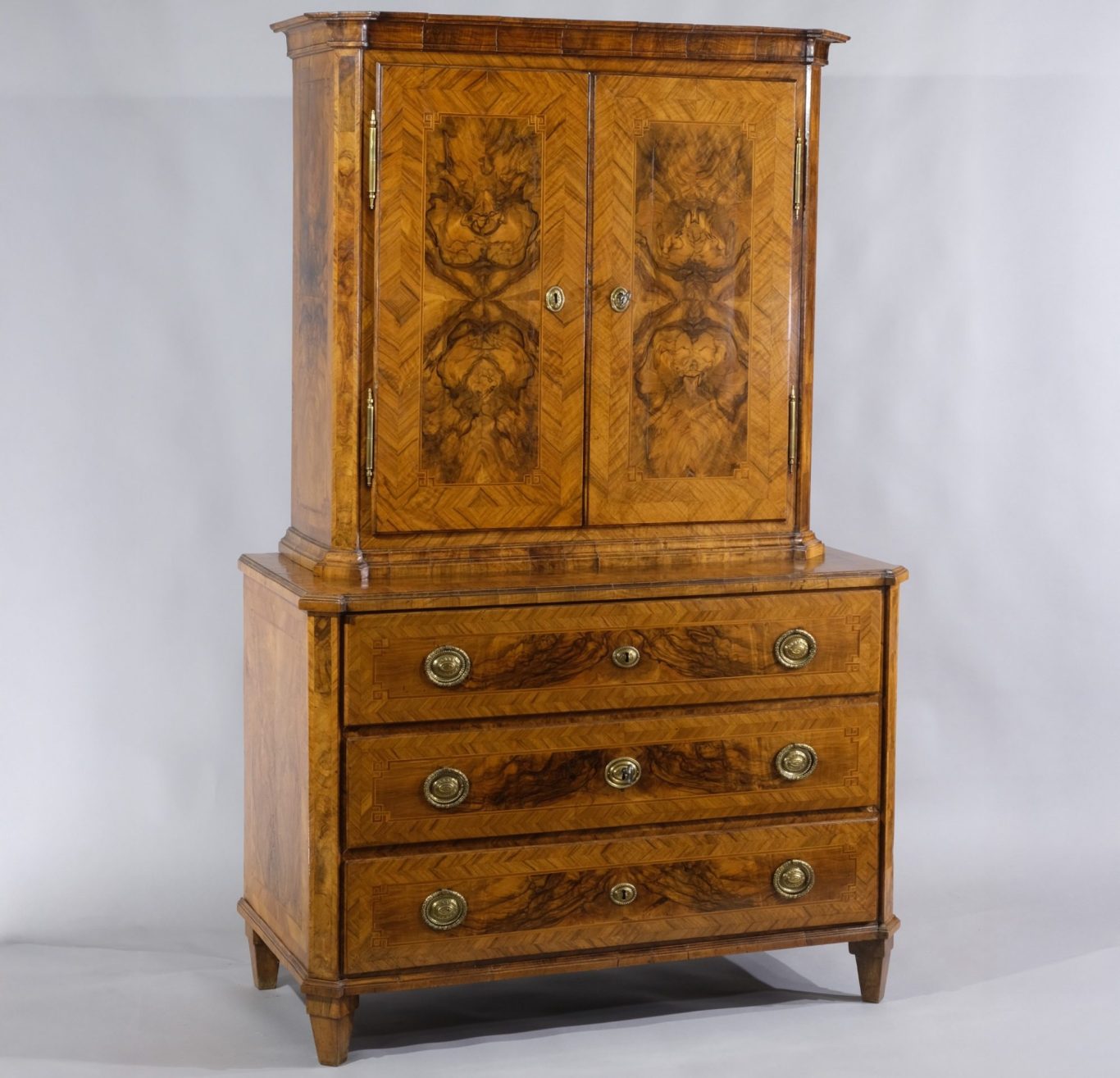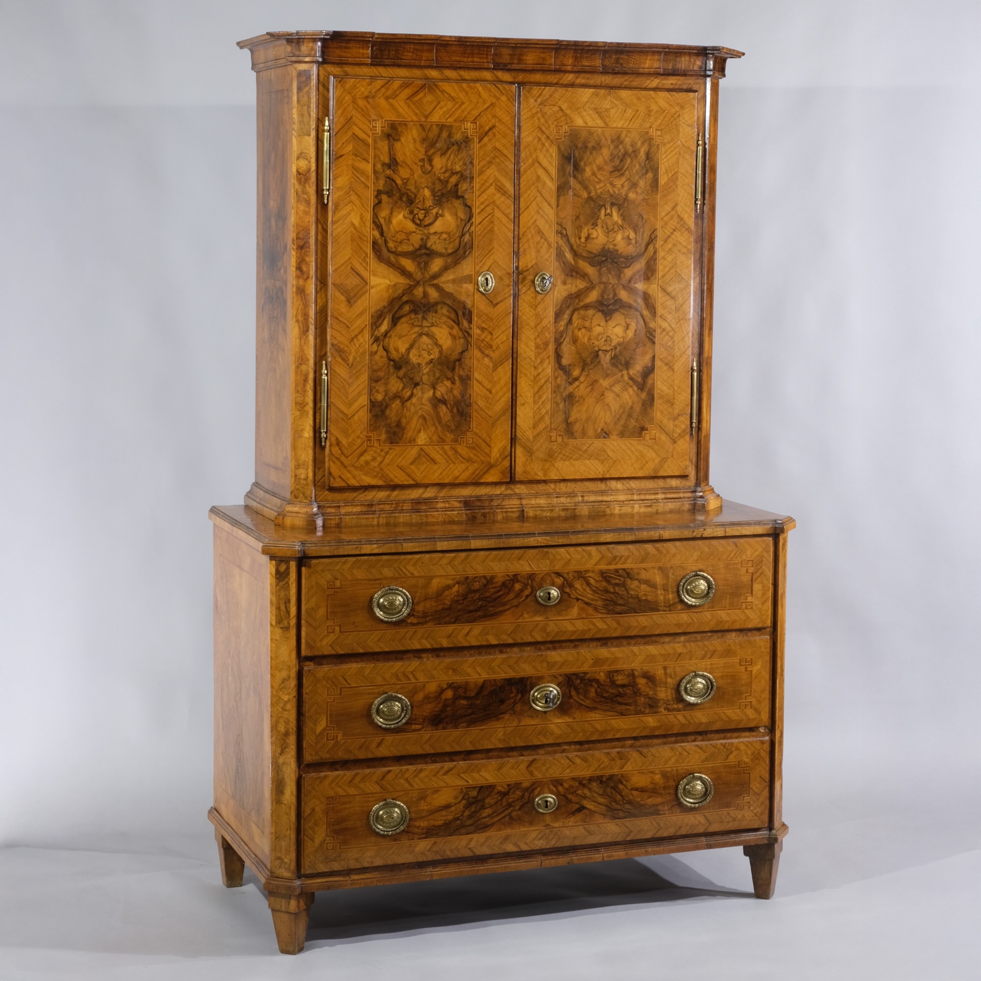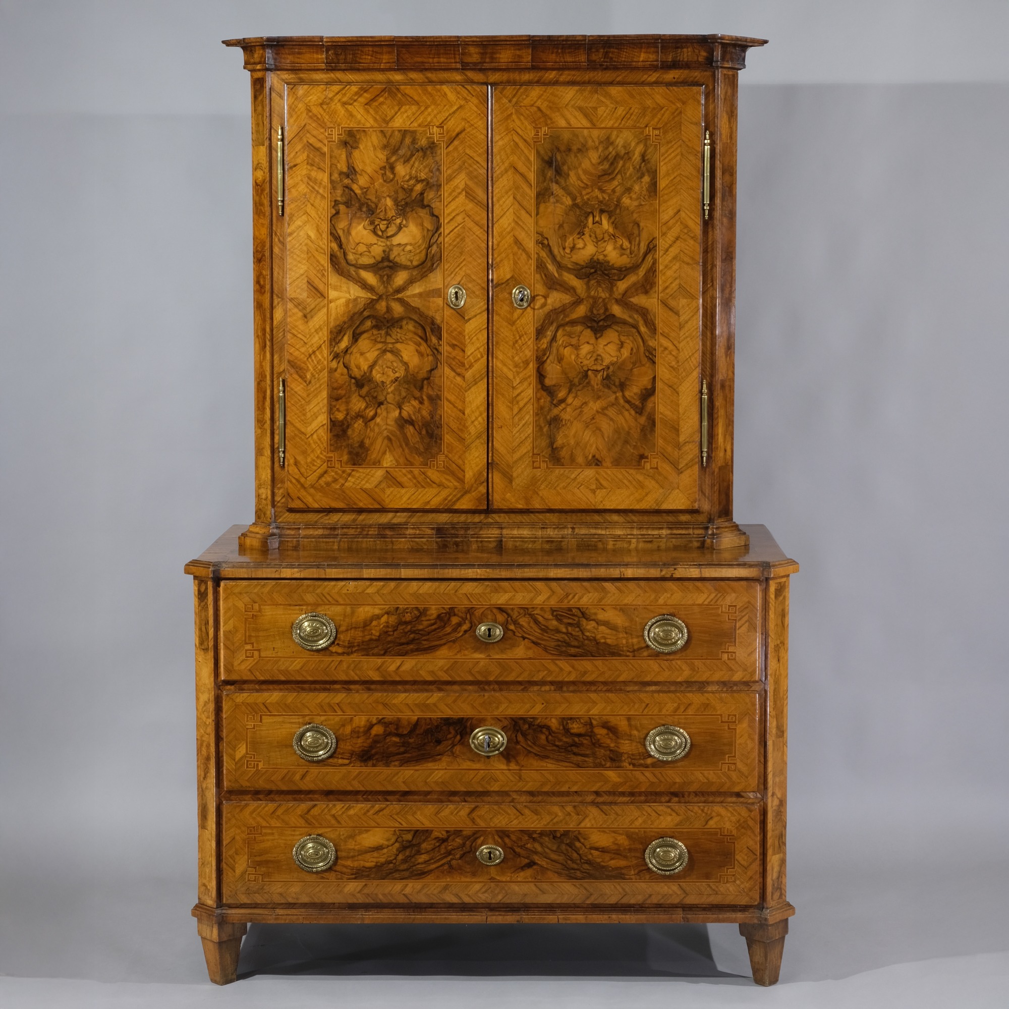 Dieses besonders gut gearbeitete Aufsatzmöbel ist in absolut originalem Zustand. Es ist nicht nur mit erlesenem Nussbaumholz gestaltet und besitzt die originalen Beschläge und Schlösser, es hat auch eine besonders schöne Ausstrahlung und Patina. Die Aufsatzkommode stammt vermutlich aus dem Rhein-Main-Gebiet und ist um 1780 entstanden.