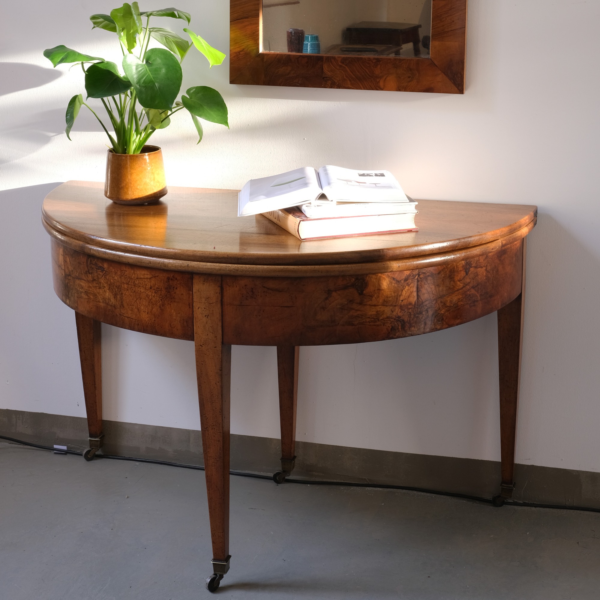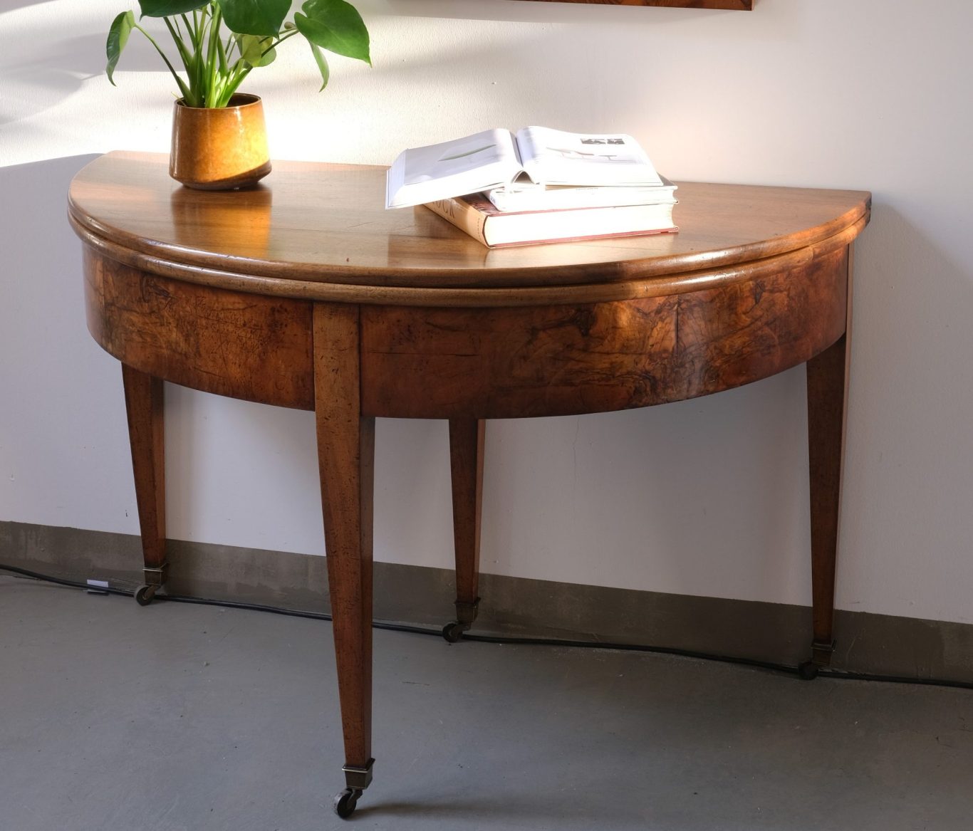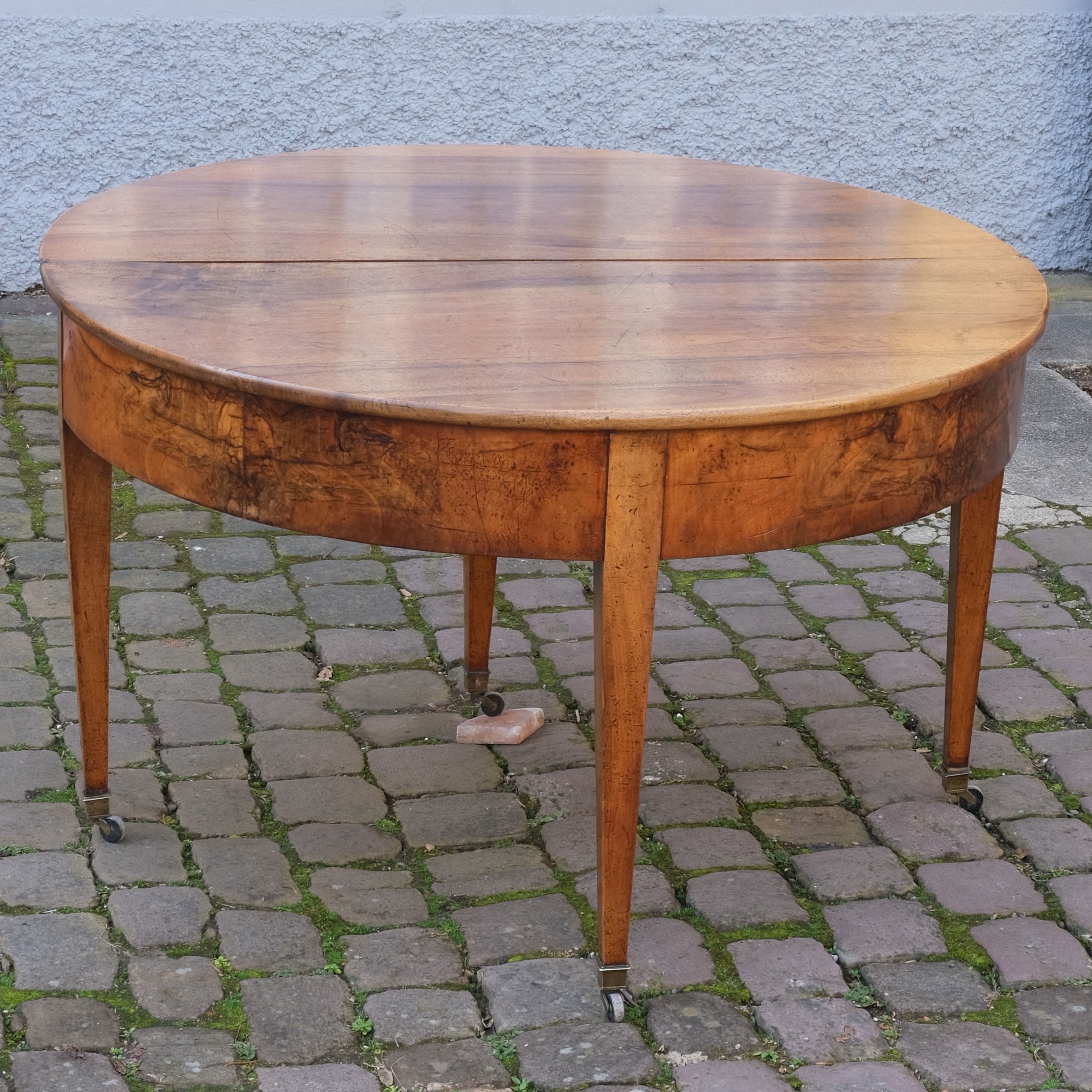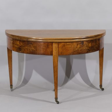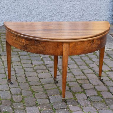 Der Demi-Lune-Tisch ist ein typischer Vertreter eines Möbels des Biedermeier um 1820. Er ist aus Nusbaum gefertigt und zu einem runden Tisch ausklappbar.