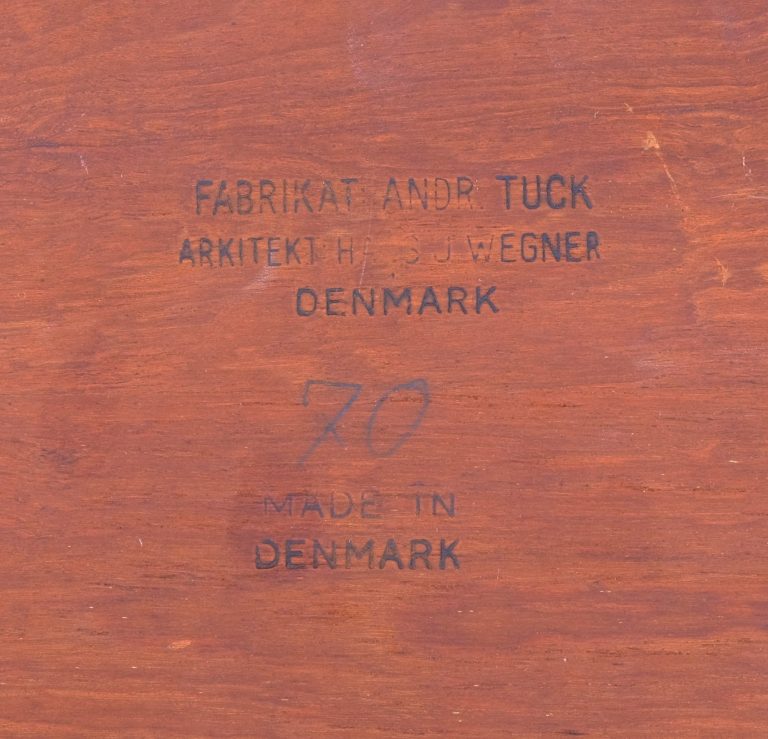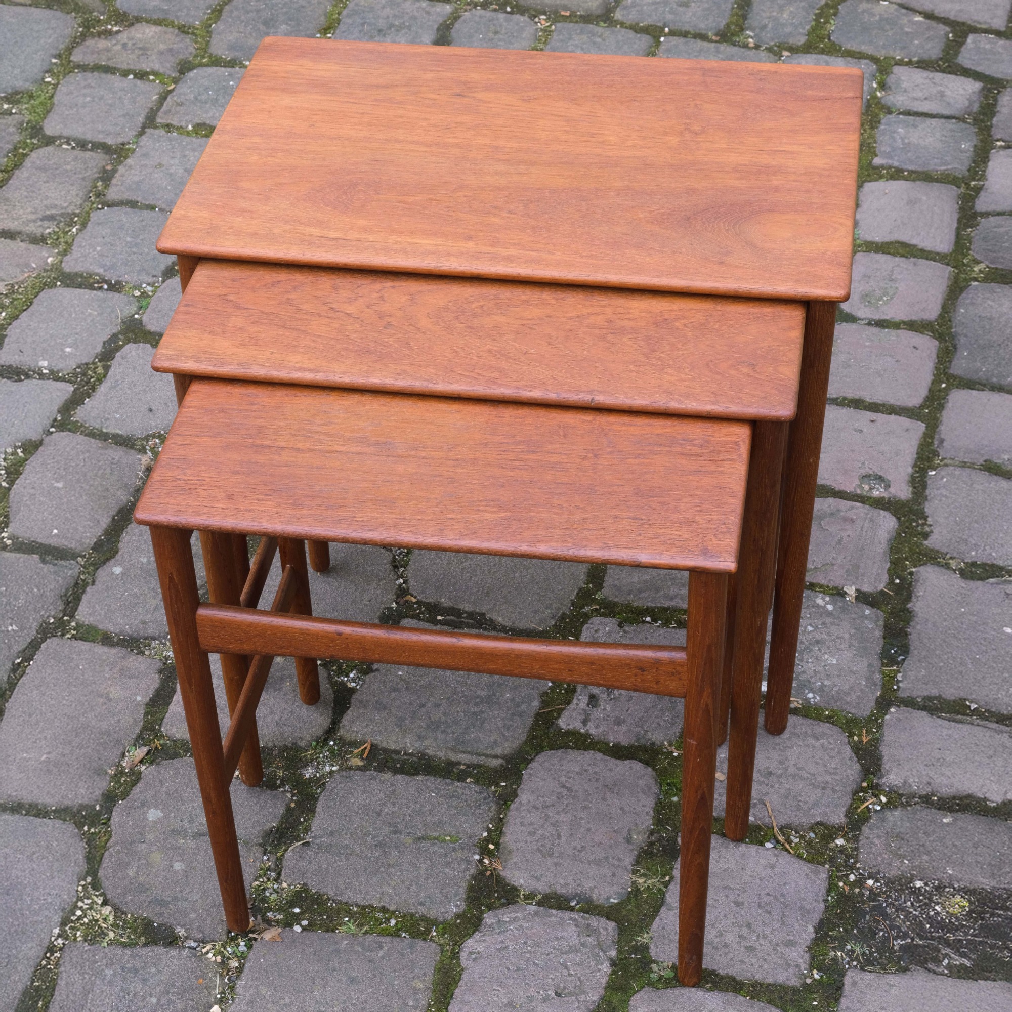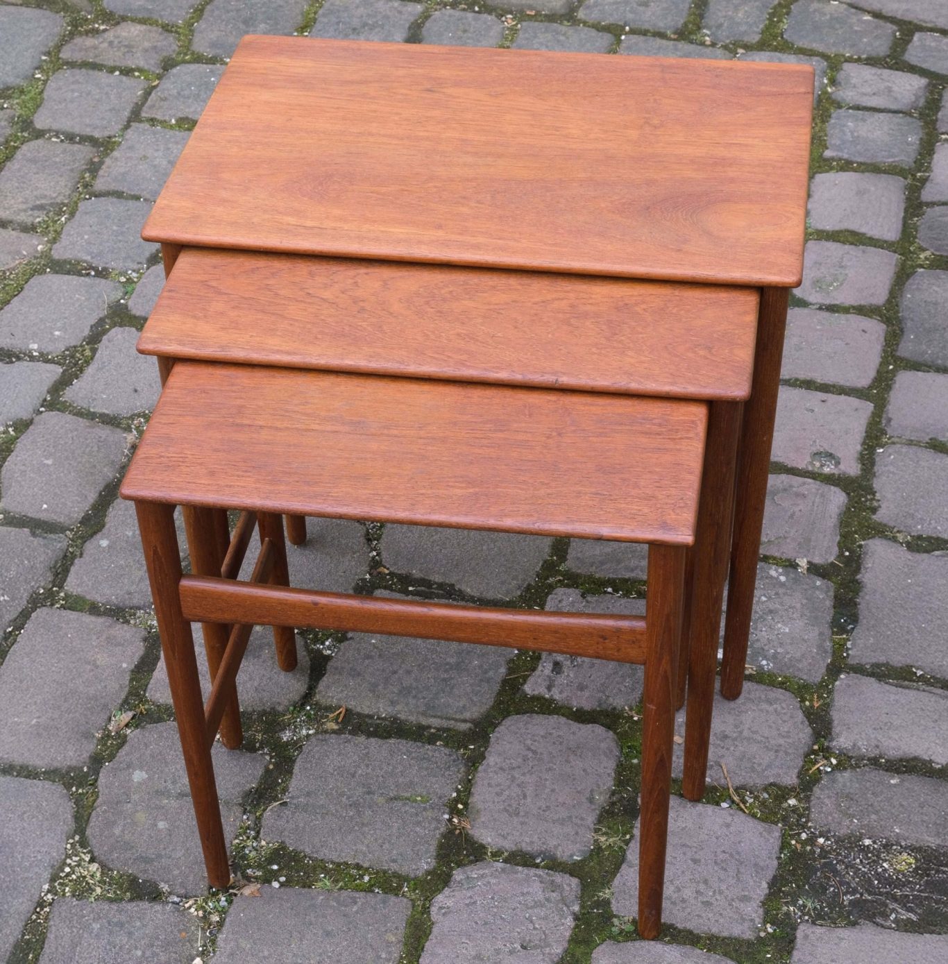 Die drei ineinander schiebbaren Beistelltischchen sind ein Entwurf von Hans J. Wegener. Die Tischchen sind gestempelt.